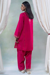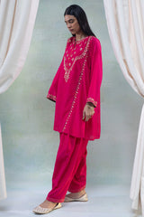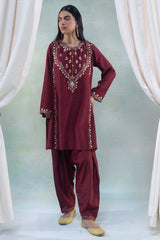A hand-embroidered paneled kurta with a round neckline and V-slit, adorned with delicate thread and sequin work. The neckline is accented with golden dori detail, adding a touch of shimmer. Paired with a classic-fit shalwar featuring fine stitching along the ankle hemline.