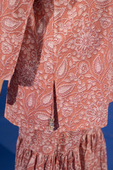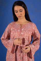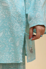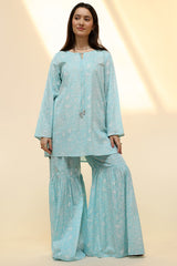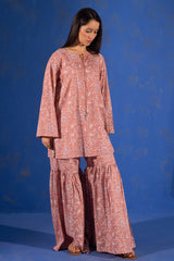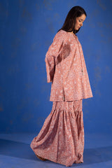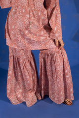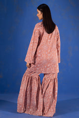Paisley-printed classic-fit shirt with a round neckline and V-slit, adorned with tassel detailing along the front and side slits. Paired with a matching printed gharara.