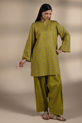 Classic-fit printed shirt with a round neckline and V-slit, adorned with delicate pleat detailing along front placket. Paired with a coordinated printed farshi shalwar, finished with stitching accents along the hemline.