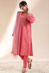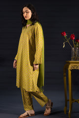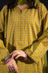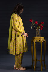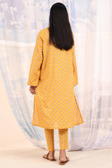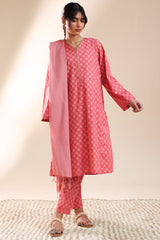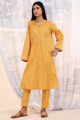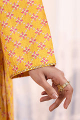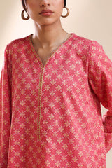 Classic-fit printed shirt with a V-neckline, exquisitely detailed with delicate gota accents along the neckline and sleeve hems. Paired with matching printed straight-fit trousers for a refined, elongated silhouette.