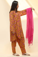 Printed classic-fit shirt with a round neckline and V-slit, finished with a softly rounded hem. Paired with a matching printed pegged shalwar, detailed with stitching along the borders.