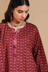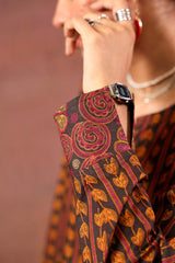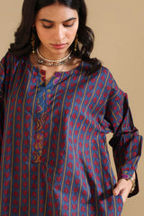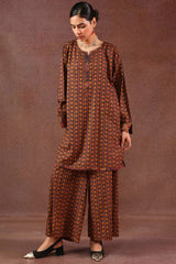A classic-fit printed shirt with a round neckline and V-slit, featuring drop shoulders and cuffed sleeves. Paired with matching printed culottes.