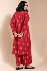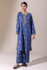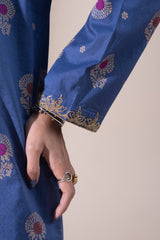 Gold-printed classic fit shirt with a round neckline and V-slit, adorned with delicate embroidered detailing on the neckline and sleeve hems. Paired with matching printed culottes.