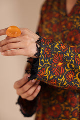 Classic-fit printed shirt with a Y-overlap placket, adorned with delicate stitching. The sleeve hems feature thread-fringe lace and pleated detailing. Paired with complementary printed culottes for a graceful, coordinated look.