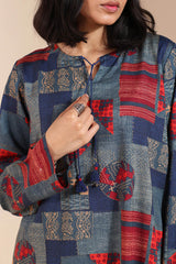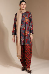 Classic-fit printed shirt with a round neckline and V-slit adorned with tassel detailing. Paired with a complementary printed classic-fit shalwar for a cohesive look.