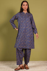 A classic-fit paneled printed shirt with a round neckline and V-slit, adorned with buttons along the front placket. Paired with a matching printed classic-fit shalwar.