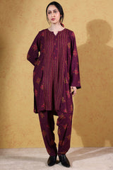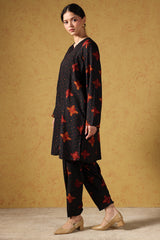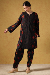 Classic-fit printed paneled shirt, detailed with subtle bead embellishments along the front slit. Paired with matching printed straight-fit trousers, finished with side slits and button detailing.