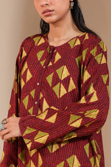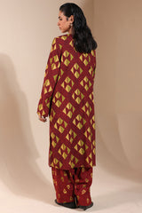 Classic-fit printed shirt with a round neckline and buttoned front placket. Paired with printed farshi shalwar for a coordinated look.