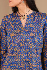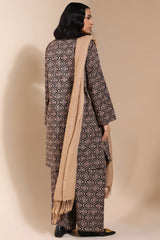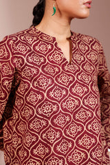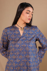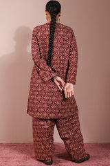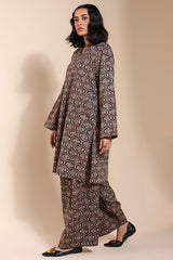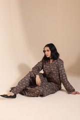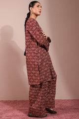 Classic-fit printed shirt with a low band neckline and V-slit. Paired with a matching printed farshi shalwar featuring stitching detail along the ankle hemline.