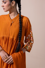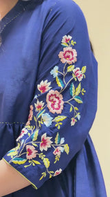 Embroidered flared shirt with a low band neckline, adorned with delicate stitching and button detailing. Features embroidered sleeves and soft gathers around the empire waist for a graceful flare. Paired with straight-fit trousers for an elegant, balanced look.