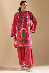 Appliqué paneled kurta with a low band neckline and buttoned front placket, adorned with delicate stitching details. Rich appliqué and embroidered accents enhance the kurta. Paired with a classic-fit shalwar, finished with appliqué detailing along the hemline.
