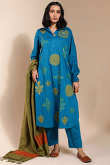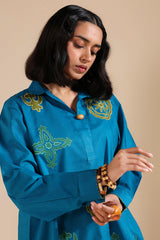Appliquéd relaxed-fit shirt with a band neckline adorned with bead detailing. Enhanced with embroidered accents and finished with cuffed sleeves. Paired with straight-fit trousers.