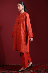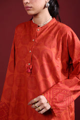 Hand-block printed paneled shirt with a low band neckline and a buttoned front placket, finished with tassel detailing. Paired with a block-printed classic-fit shalwar featuring subtle stitching along the ankle hemline.