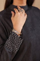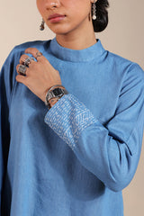 Denim short shirt with a low band neckline and keyhole detail at the back. Delicate thread-stitched patterns grace the back and sleeve hems, paired with classic culottes for a refined everyday look.