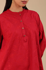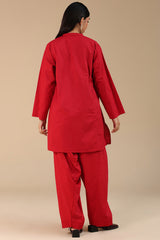 Embroidered classic-fit paneled kurta with a low band neckline and a buttoned front placket. Paired with a classic-fit shalwar, finished with embroidered detailing at the ankle hemline.