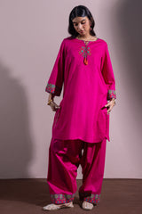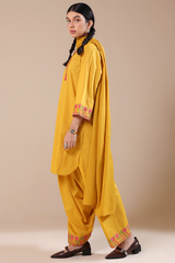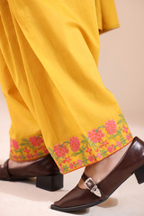 Embroidered paneled shirt with a round neckline and V-slit, adorned with stitching and tassel detailing. The cross-stitch embroidery is enhanced with mirror work, while bead-lace accents finish the sleeve hems. Designed with a rounded shirt hem. Paired with a classic-fit shalwar featuring embroidered detailing along the ankle hemline.