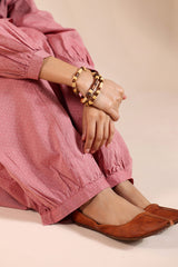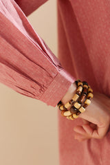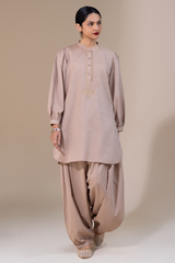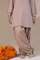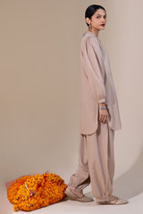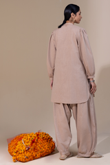 Classic-fit embroidered shirt on textured fabric with a low band neckline and buttoned front placket. Finished with puff sleeves, cuffed hems, and a round shirt hem. Paired with textured fabric Jasmine shalwar for an understated look.