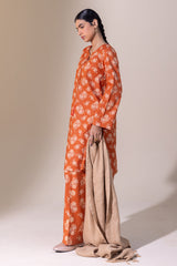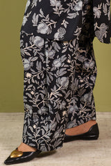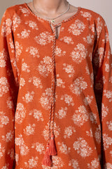 A classic-fit printed shirt with a round neckline and V-slit, adorned with dori tassel detailing. Finished with a rounded hem and paired with a matching printed classic-fit shalwar.