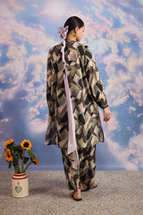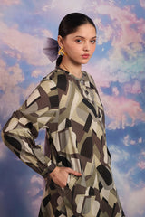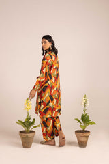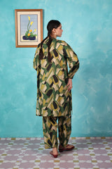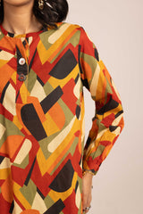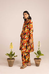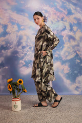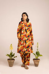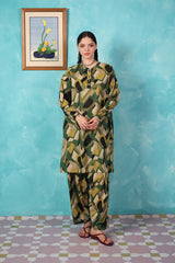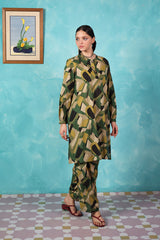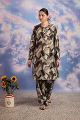 A loose-fit printed kurta featuring a band round neckline and buttons on the front placket. The cinched sleeves add a structured touch. Paired with a matching printed classic-fit shalwar, enhanced with stitching detail around the ankle hemline.
