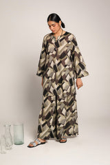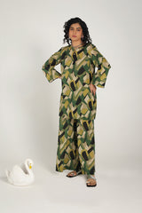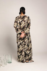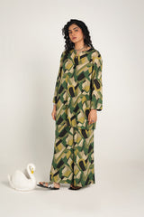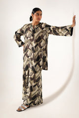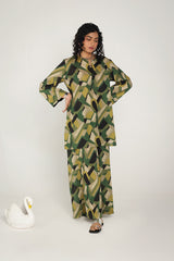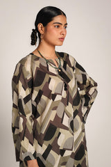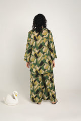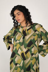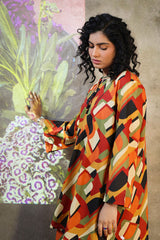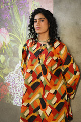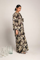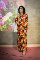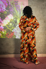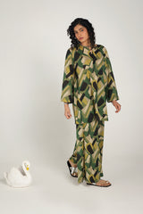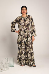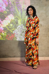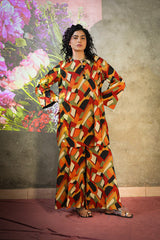Bringing a retro charm, this loose-fit kurta showcases a vibrant print with a round neckline and a V-slit adorned with tassel detail. Paired with matching printed wide-leg flared trousers for a statement look.