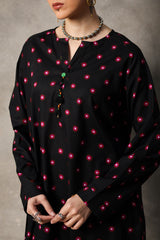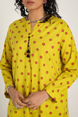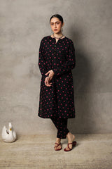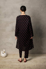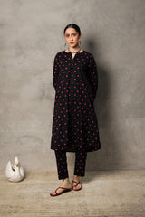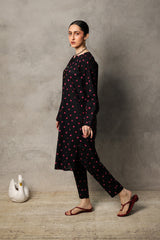 This subtle printed, relaxed-fit kurta features a round neckline with a V-slit, adorned with bold block-out buttons and tassels for added detail. The matching printed straight-fit trousers complete the ensemble for a cohesive look.