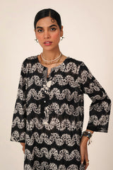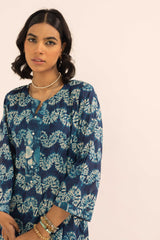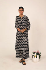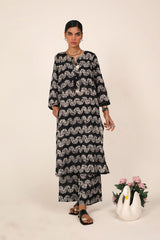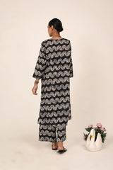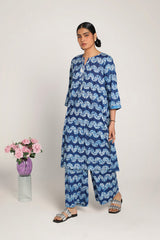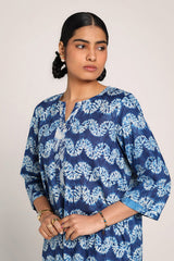 A classic-fit kurta showcases a natural tie-and-dye print with a round neckline and a V-slit, accented with intricate Mukesh detailing on the placket. The look is completed with matching printed classic culottes, offering a balanced and elegant ensemble.