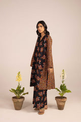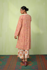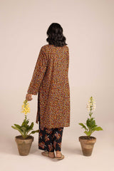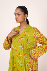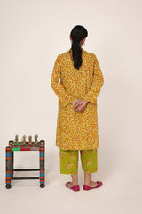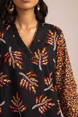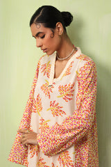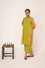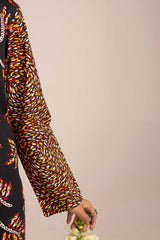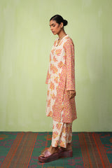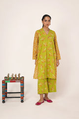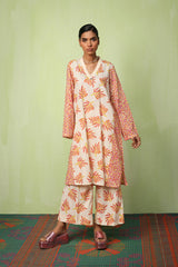 A paneled printed shirt with a V-neckline adorned with button detailing. Paired with contrasting printed culottes.