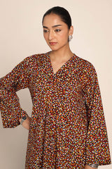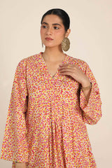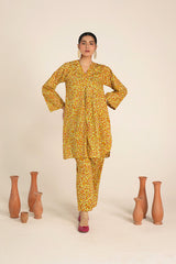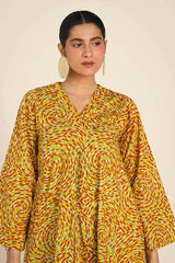 A loose-fit spiral-printed kurta featuring a V-neckline, delicately enhanced with gathers that lend a natural flare to the silhouette. Paired with matching printed culottes, this set offers effortless movement and a touch of modern charm.