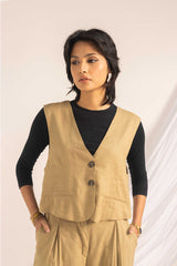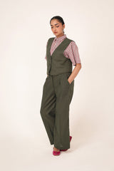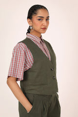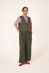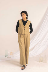 A two-piece linen set featuring a sleeveless buttoned vest with a V-neckline and welt pockets, paired with wide-leg pleated trousers featuring side pockets for added functionality. Styled with a checkered button-down for a vintage-inspired touch.