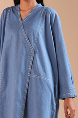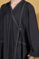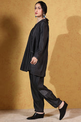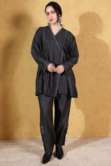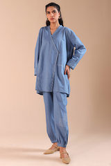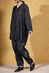 Relaxed-fit asymmetrical shirt, enhanced with Sashiko-stitching and button detailing. Designed with turn-up sleeves for a structured finish. Paired with a classic pegged shalwar, featuring cuffed hems adorned with subtle stitching patterns for a refined contemporary look.