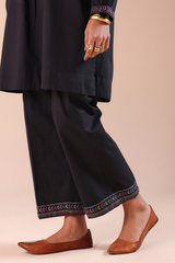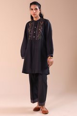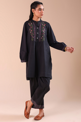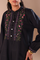 Hand-embroidered classic-fit shirt with a low band neckline and a buttoned front placket. Delicate embroidery enhances the bodice and cuffed sleeve hems, adding refined artisanal detail. Paired with culottes finished with embroidered borders.
