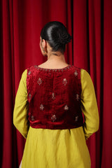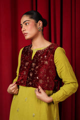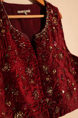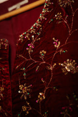 A formal koti featuring a round neckline with a V-slit open front, beautifully embellished with beadwork, sequin detailing, and intricate tilla taanka work, creating an elegant and refined look.