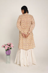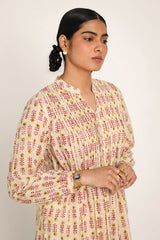 A relaxed-fit handcrafted kurta features a band V-neckline. The front placket is adorned with buttons, while the bodice is enhanced with delicate pleats for added texture. The cinched sleeves offer a tailored touch, making this kurta versatile enough to pair with any generation Bottoms.