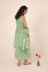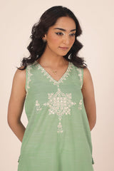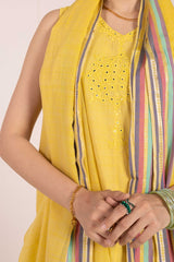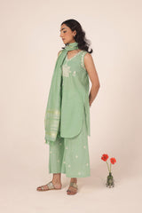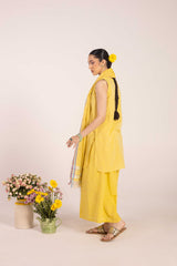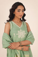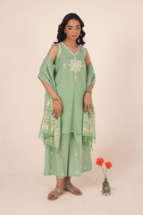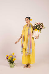 A classic fit embroidered kurta with a V-neckline, adorned with delicate, intricate embroidery on the neckline and shoulders. The bodice is enhanced with fine embroidered details, further accentuated with Aina work. Paired with wide-leg embroidered trousers. Comes with a solid-hued dupatta, finished with gold denier borders and frilled edges.