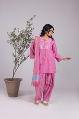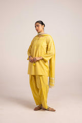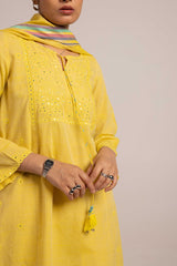 A classic-fit, paneled, mid-length kurta features a round neckline with a V-slit and delicate tassel detailing. The bodice is beautifully embroidered with intricate patterns, enhanced with Aina work. The sleeve hems are also detailed with fine embroidery, further elevated by Aina work. Paired with solid-hued, classic-fit shalwar, which has stitching details at the ankle hemline, the look is completed with a dupatta, adorned with denier borders and frills along the edges.