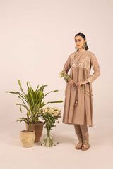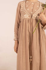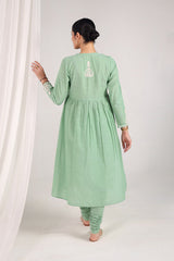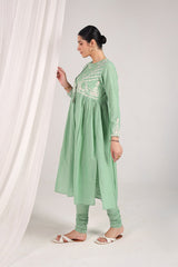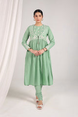 A koti-style flared kurta features a round neckline and an intricately embroidered bodice enhanced with aina work. The koti is detailed with embroidery, tassels, and mirror accents, while the gathered empire waist adds graceful volume. Embroidered sleeve hems and back motifs complete the look. Paired with a solid-hued churidar pajama for a timeless finish.