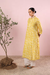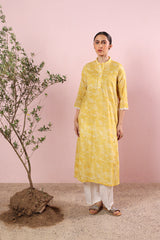 A classic-fit printed kurta featuring a band neckline and a front placket adorned with delicate stitching and embellishment details. Finished with lace-trimmed sleeve hems. Pair with any Generation bottoms for a complete and graceful look.