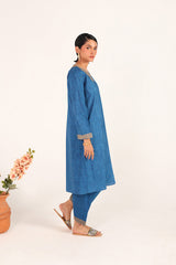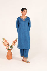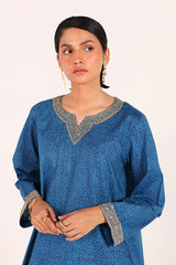 A loose-fit Ajrak-inspired printed kurta featuring a round neckline with a V-slit, adorned with delicate tilla embroidered detailing. The sleeves mirror the same embroidery for a cohesive look. Paired with a matching printed classic-fit shalwar, finished with tilla embroidery on the ankle hem for a traditional yet polished appeal.