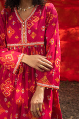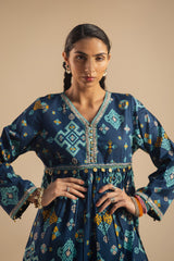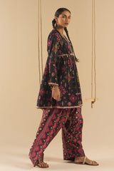 Classic-fit short gathered shirt with a V neckline, featuring sequin detailing along the front slit and coin embellishments at the empire waist and sleeve hems. Gathers at the empire waist create a flared silhouette. Paired with a coordinated printed farshi shalwar.