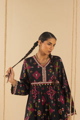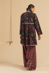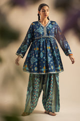 Classic-fit short gathered shirt with a V neckline, featuring sequin detailing along the front slit and coin embellishments at the empire waist and sleeve hems. Gathers at the empire waist create a flared silhouette. Paired with a coordinated printed farshi shalwar.