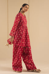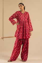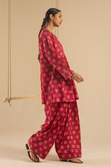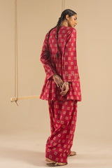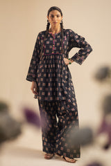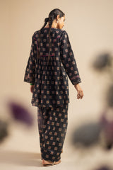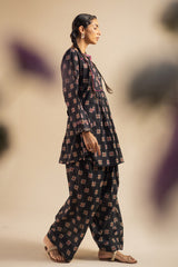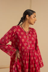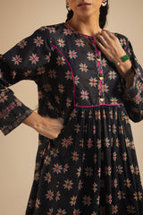 Printed gathered shirt with a V neckline, adorned with sequin detailing along the front slit and coin embellishments at the empire waist and sleeve hems. Gathers create a softly flared silhouette. Paired with a coordinated printed farshi shalwar.