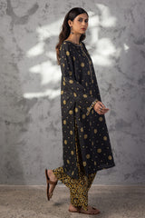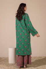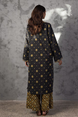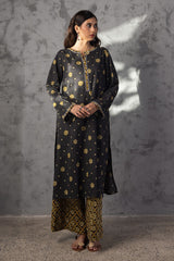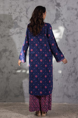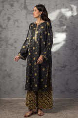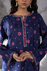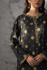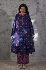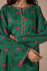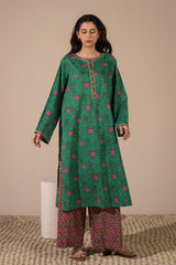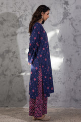 Classic-fit printed shirt with a round neckline and V-slit, adorned with delicate embroidered detailing along the neckline and sleeve hems. Paired with coordinated printed culottes.