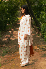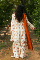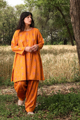 Printed classic-fit shirt with tonal braided detailing along the neckline and sleeve hems. Paired with a matching printed khula poncha shalwar.