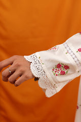 Printed classic-fit shirt with a round neckline and V-slit, adorned with tassel detailing. Finished with delicate lace along the sleeves and shirt borders. Paired with matching printed culottes for a coordinated, refined look.