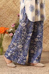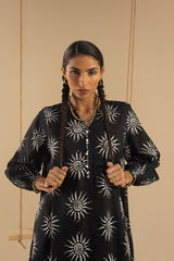 Classic-fit printed shirt with a round neckline and V-slit, adorned with button detailing along the front slit. Featuring smocked sleeve hems and a rounded hemline. Paired with coordinated printed culottes.