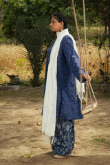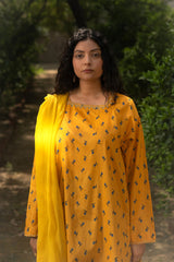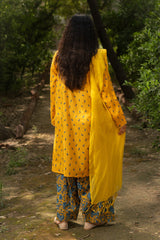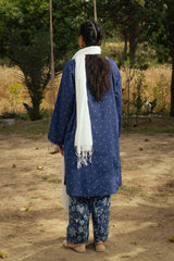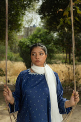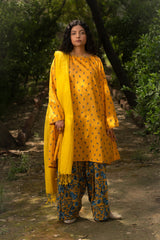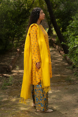 Printed classic-fit shirt with a square neckline, adorned with delicate embroidered detailing along the neckline and sleeve hems. Paired with a coordinated printed farshi shalwar.