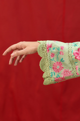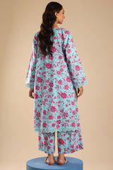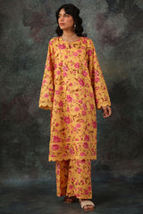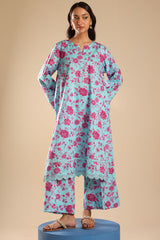 Printed classic-fit shirt with a round neckline and V-slit, detailed with lace along the sleeves and shirt hemline. Paired with matching printed culottes.