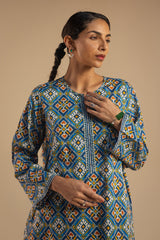 Classic-fit printed shirt with a round neckline and V-slit, adorned with embellishment along the front slit. Paired with coordinated printed culottes.