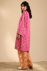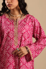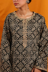 Classic-fit printed shirt with a round neckline and V-slit, delicately adorned with fine embroidery along the neckline and sleeve hems. Paired with a coordinated printed classic-fit shalwar.