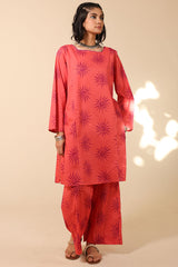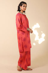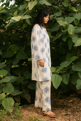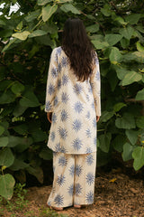 Medium length classic-fit printed shirt with square neckline, finished with stitching detail. Paired with matching printed culottes.